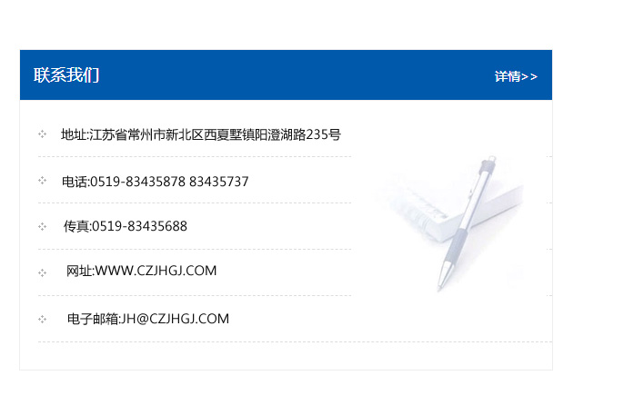 傳真:0519-83435688    郵編:213135    網址:WWW.czjhgj_com.tzmaohua.com    電子郵箱:JH@czjhgj_com.tzmaohua.com